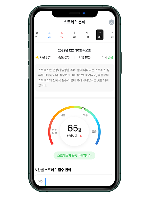 심박변이도(HRV)을 기반으로 심박간격 사이의 변동성을 측정하여 오늘 하루의 스트레스를 알아볼 수 있습니다. 스트레스 점수를 확인해 적절한 휴식 타이밍을 가집니다. 매 10분 간격으로 자동 측정됩니다.